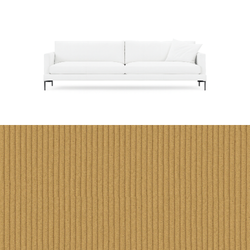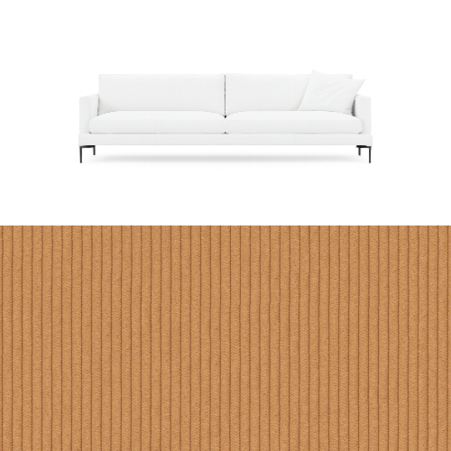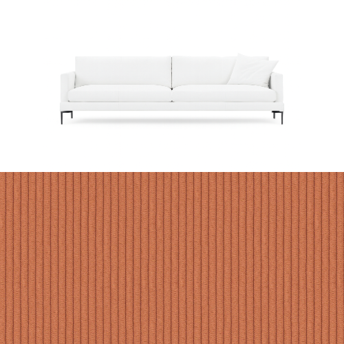 Den skräddarsydda klädseln från OOAKI är anpassad för soffans strama form och ger ett rent och balanserat helhetsintryck. Klädseln är huvudprodukten i förvandlingen och gör det möjligt att förändra soffans uttryck utan att påverka dess design eller funktion.